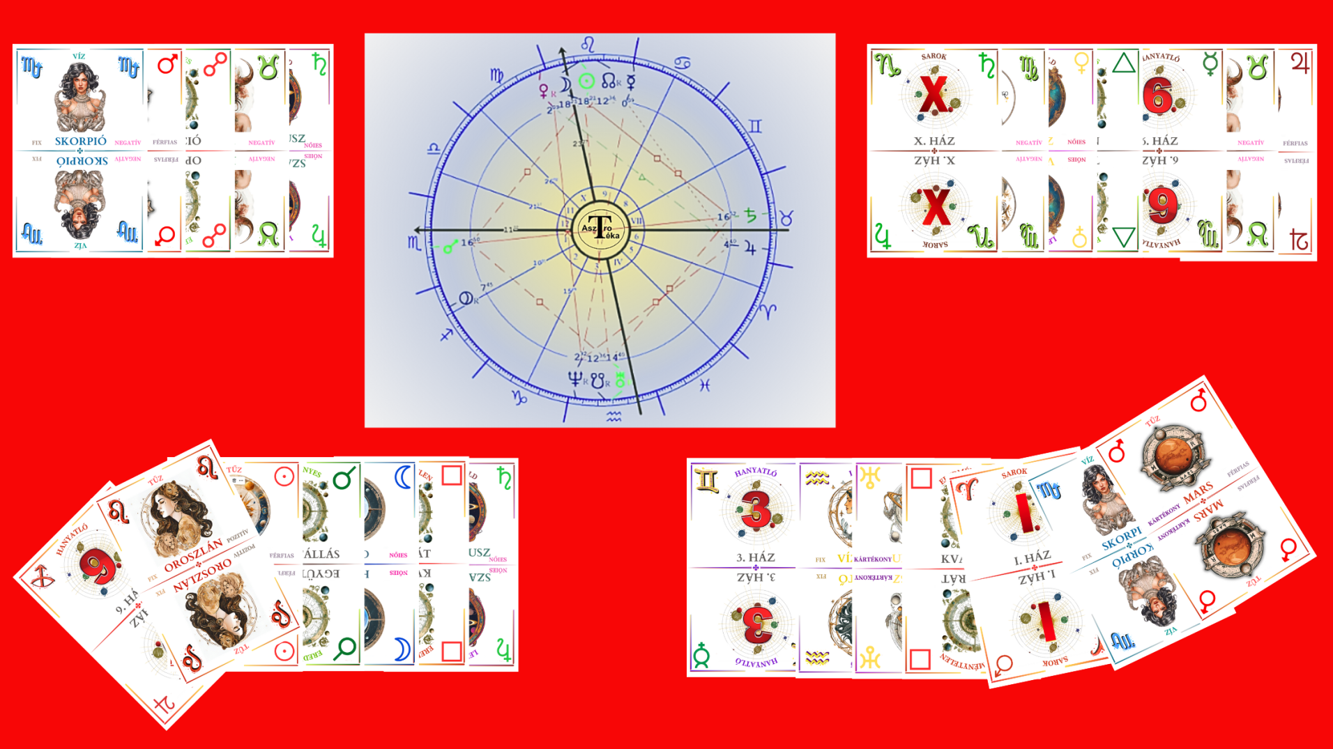 1. analógiás összetartozásuk szerint, (egy jegy + egy ház + egy bolygó) - értelemszerűen itt csak hármasával, mert minden darabjának stimmelnie kell egymáshoz, azaz: