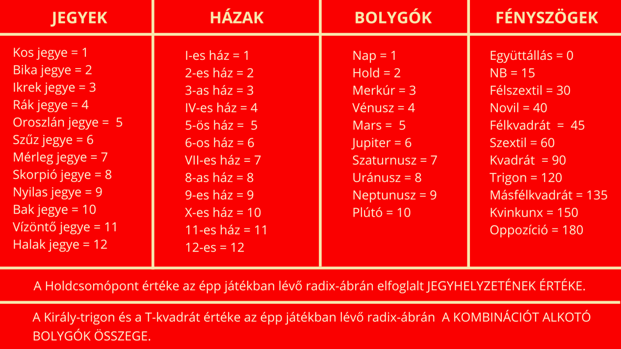 Fontos szabály, hogy a radix-állások lepakolásánál a sorok NEM KEZDŐDHETNEK (de végződhetnek) Holdcsomóponttal – hiszen az nem sugárzó pont, tehát nem indít (csak befogad) fényszöget.